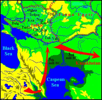 From The Relationship of the Altaic and Turkic languages. http://alterling.ucoz.de/index/the_relationship_of_the_altaic_and_turkic_languages/0-19 << Earlier, using the graphical-analytical method, we found the Turkic Urheimat in the South Caucasus (see The Nostratic languages. ) and then localized the habitats of Turkic tribes speaking particular dialects, originated from the common parent Turkic language, in East Europe (see The uprising of the Turkic Languages) . Only to the end of the 3rd mill BC the most part of Turkic tribes crossed the Don and dispersed in the Volga river basin, the Northern Caucasus, and further in the steppes of Kazakhstan. In such way they arrived to Altai. Such assertion contradicts Altaic theory of the origin Turkic languages based upon the fact of common features between the Turkic and Mongolic languages. But these common features can have other explanation as genetic relationship. >>